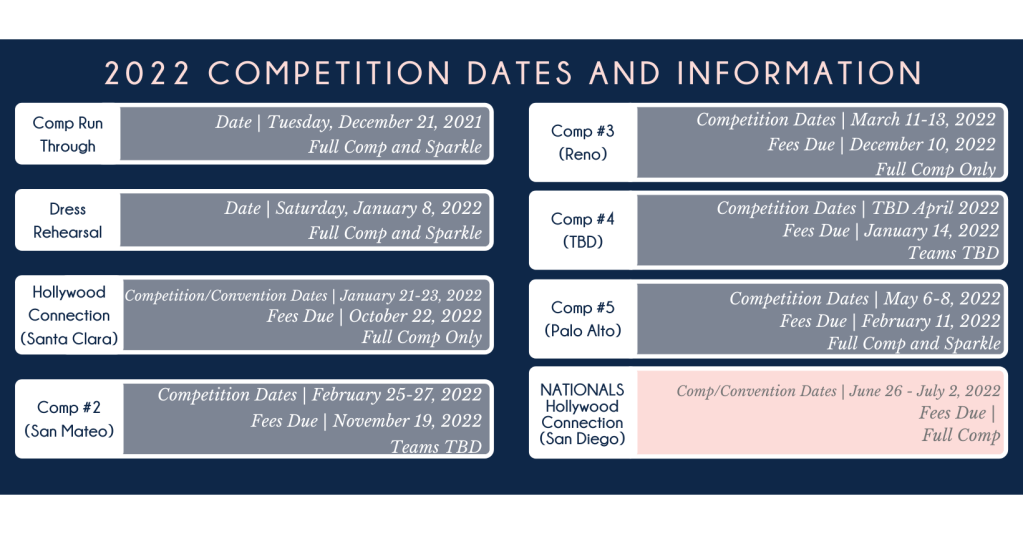 January 11th & 12th we will be having rehearsals for the teams to get ready for our first competition Hollywood Connection. Please put these dates on your calendar.